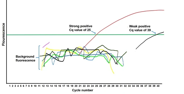 In real-time PCR, a positive reaction is determined by the accumulation of a fluorescent signal. Generally, real-time assays undergo 40 cycles of amplification. The cycle at which the fluorescent signal can be detected is termed cycle quantification (Cq) value.